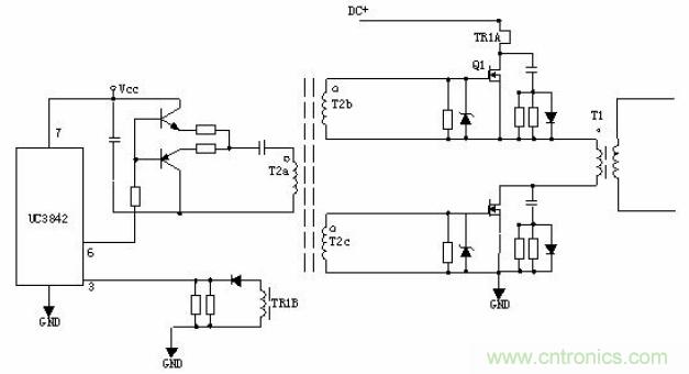 5、有驅(qū)動(dòng)變壓器的功率變換電路:T2為驅(qū)動(dòng)變壓器,T1為開關(guān)變壓器,TR1為電流環(huán)。