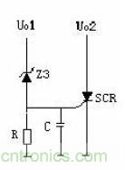 如上圖,當(dāng)Uo1輸出升高,穩(wěn)壓管(Z3)擊穿導(dǎo)通,可控硅(SCR1)的控制端得到觸發(fā)電壓,因此可控硅導(dǎo)通。Uo2電壓對地短路,過流保護(hù)電路或短路保護(hù)電路就會(huì)工作,停止整個(gè)電源電路的工作。當(dāng)輸出過壓現(xiàn)象排除,可控硅的控制端觸發(fā)電壓通過R對地泄放,可控硅恢復(fù)斷開狀態(tài)。