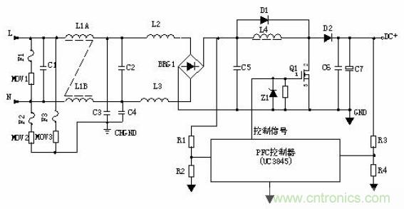 輸入電壓經(jīng)L1、L2、L3等組成的EMI濾波器,BRG1整流一路送PFC電感,另一路經(jīng)R1、R2分壓后送入PFC控制器作為輸入電壓的取樣,用以調(diào)整控制信號的占空比,即改變Q1的導(dǎo)通和關(guān)斷時(shí)間,穩(wěn)定PFC輸出電壓。L4是PFC電感,它在Q1導(dǎo)通時(shí)儲(chǔ)存能量,在