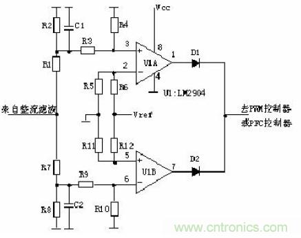 Q1關(guān)斷時(shí)施放能量。D1是啟動(dòng)二極管。D2是PFC整流二極管,C6、C7濾波。PFC電壓一路送后級電路,另一路經(jīng)R3、R4分壓后送入PFC控制器作為PFC輸出電壓的取樣,用以調(diào)整控制信號的占空比,穩(wěn)定PFC輸出電壓。
