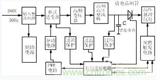 圖1示出電源原理框圖,整個(gè)電路可分為主電路(電力變換電路)和控制電路兩大部分。來自電網(wǎng)的380V交流電壓經(jīng)整流濾波后得到約520V左右的直流電壓,加到橋式逆變器上。逆變器主功率開關(guān)采用三菱公司的CT60型IGBT管。PWM電路產(chǎn)生一對(duì)相位互差180°的脈沖電壓控制逆變橋的四個(gè)功率管,將直流電壓變換為高頻方波電壓,再經(jīng)高頻高壓整流橋得到高壓直流(約1400V),向儲(chǔ)能電容Co充電。電容Co上電壓充到預(yù)定值(1000V)后,控制電路發(fā)出信號(hào),將放電晶閘管觸發(fā)導(dǎo)通,Co上電壓快速向負(fù)載氙燈釋放,激光器正常工作。