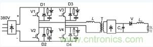 圖2示出電源主電路,V1—V4組成橋式逆變器,兩端并聯(lián)RCD吸收支路,L為限流電感,Co為儲(chǔ)能電容,Lo用于限制Co對(duì)負(fù)載氙燈的放電電流,保護(hù)氙燈。
