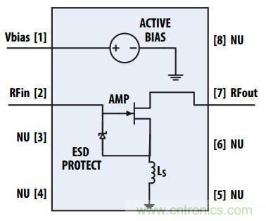 圖:MMIC本身由一個(gè)單個(gè)的FET共源放大器和一個(gè)動(dòng)態(tài)偏壓調(diào)制器組成