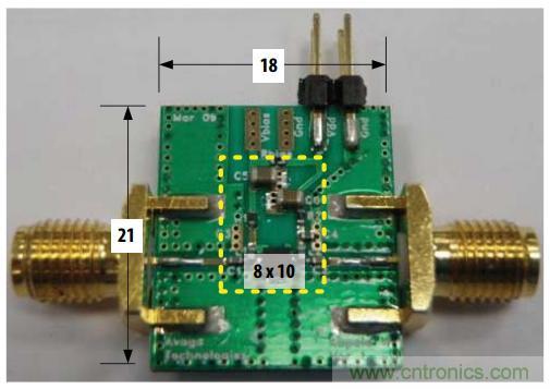 圖中PCB的尺寸為21.5×18×1.4mm,PCB板材有兩層,頂層為Rogers的RO4350,厚度為10mil,底層為低成本的FR4,厚度為 1.2mm,二者的接地銅箔緊緊的結(jié)合在一起。射頻連接器是Johnson的SMA接頭,DC電源接頭是2-pin的連接器,被動(dòng)元件的尺寸都是0402 的,這樣整個(gè)元器件區(qū)域的大小約為8×10mm2。