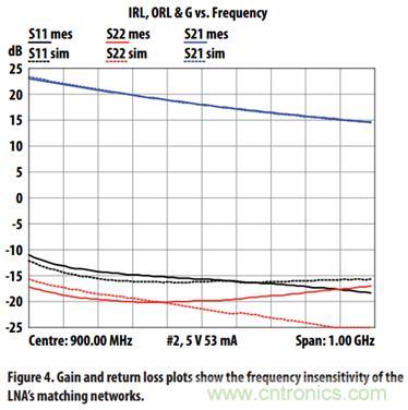 在900MHz,低噪放的噪聲大約為0.3dB,增益大約為18dB,輸入和輸出回波損耗為小于-15dB。另外,在1GHz的帶寬內(nèi),回波損耗都可以滿(mǎn)足 這個(gè)要求。從系統(tǒng)的角度來(lái)說(shuō),這個(gè)是非常受歡迎的特性。主要是由于傳統(tǒng)的基站需要靠隔離器或者3dB耦合器來(lái)滿(mǎn)足系統(tǒng)回波損耗的要求。進(jìn)一步來(lái)說(shuō),輸入輸 出匹配的寬帶寬也使得基站的雙工器或者輸入輸出濾波器的使用調(diào)試變得簡(jiǎn)單,降低了系統(tǒng)的設(shè)計(jì)復(fù)雜度。