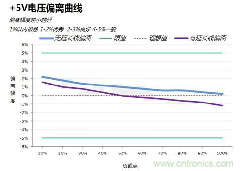 然后看下電源電壓偏離對比,可以發(fā)現(xiàn)在加入了延長線之后,電源的電壓也有一定程度的影響。其中+12V影響較大,+5V和+3.3V影響較小。