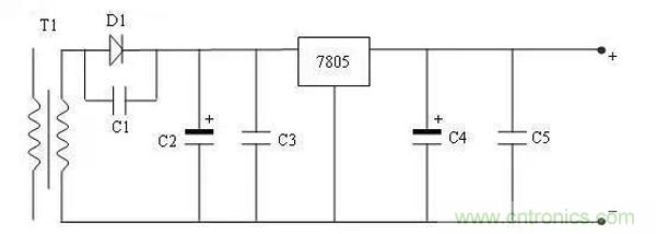 經(jīng)檢查,供光譜儀主板的直流5V電源僅剩2.3伏左右,脫開5V直流電源的負(fù)載,通電再次測量5V直流電源,這時則有5V,初步判斷此5V直流電源帶載能力差,拆開電源外殼進行檢修,由于沒有帶負(fù)載時,通電有直流5V輸出,故重點檢查次級線圈側(cè)的輸出整流電路,給5伏電源接上假負(fù)載通電進行測量發(fā)現(xiàn)三通穩(wěn)壓7805的1、2腳之間電壓為5.2伏,2、3腳之間卻剩2.3伏,如圖4,故判斷三通穩(wěn)壓管7805性能變壞,更換三通穩(wěn)壓管7805故障解決。