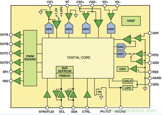 該器件非常適合高密度DC-DC電源轉換,具有6個可編程脈沖寬度調制(PWM)輸出,可控制大部分高效電源拓撲。另外,該器件還能控制同步整流(SR),并集成6個模數(shù)轉換器(ADC),能夠采樣模擬輸入電壓、輸入電流、輸出電壓、輸出電流、溫度以及其它參數(shù)。轉換為數(shù)據(jù)后,將這些信號發(fā)送至數(shù)字內核模塊進行處理。該器件采用靈活的狀態(tài)機架構,以硬件實現(xiàn)全部功能,提供穩(wěn)定可靠的解決方案,但無法通過編程實現(xiàn)設計以外的功能。器件的全部功能--包括輸出電壓調整--均以數(shù)字方式處理。為了調整輸出電壓,應通過PMBus接口發(fā)送一條命令,改變數(shù)字基準電壓值。