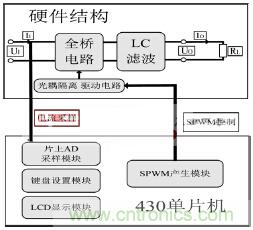 考慮到系統(tǒng)效率,不需要進行boost升壓,可以直接逆變。故本系統(tǒng)結構圖如圖1所示。SPWM信號控制硬件全橋電路,然后經(jīng)過LC濾波電路可以得到正弦波。以MSP430單片機為核心的數(shù)字控制系統(tǒng)需要采樣電流量、控制硬件電路系統(tǒng)以及形成良好的人際交互界面。