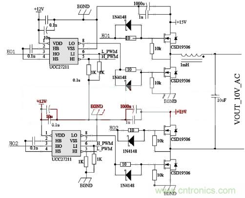 可以濾除載波頻率??紤]到MOS管需要相對較小的導通電阻RDS(on)和較小上升時間和下降時間的,本系統(tǒng)選用CSD19506。本系統(tǒng)需要驅動全橋,為了提高MOSFET的導通速度,降低開關損耗,因而選用TI提供的高速半橋驅動芯片UCC27211。圖2是全橋部分電路圖。