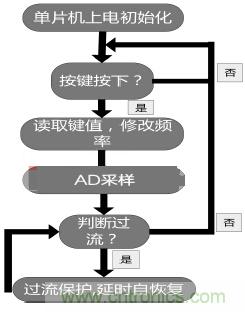 軟件結構框圖如圖1,主程序框圖如圖3。程序執(zhí)行的流程如下所述:單片機上電之后,系統(tǒng)進行按鍵、片上ADC12和LCD顯示屏初始化,程序查詢按鍵,若有相應按鍵按下,修改正弦波頻率,然后AD采樣電流判斷是否過流;否則返回繼續(xù)查詢按鍵。如果輸出過流,程序將關閉SPWM輸出,延時自恢復;否則返回按鍵查詢。