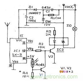 IC1是一只SX-3型人體接近開(kāi)關(guān)集成電路模塊,該器件最大探測(cè)距離可達(dá)10米。其中紅線接正電源端,黑線接公共端,黃線為+5v電源輸出端,供外部使用,藍(lán)線為即時(shí)開(kāi)關(guān)信號(hào)輸出端(本電路不用),綠線為具有時(shí)間累積功能的延時(shí)開(kāi)關(guān)信號(hào)輸出端。220V市電由C1降壓、D1整流、C2濾波、DW穩(wěn)壓后為控制電路提供12V直流電源。平時(shí),沒(méi)有人接近IC1或當(dāng)行人很快從報(bào)欄前經(jīng)過(guò)時(shí),IC1的VO2端輸出低電平,后級(jí)電路不動(dòng)作,燈不亮。當(dāng)有人要看報(bào)在報(bào)欄前停頓數(shù)秒后,IC1的V02端輸出高電平。白天時(shí),光敏電阻Rcds為低阻值,V1導(dǎo)通,V2截止,后級(jí)電路仍不能工作。晚聞Rcds為高阻值,V1截止,的高電平使V2導(dǎo)通,光電耦合器IC2內(nèi)藏發(fā)光二極管發(fā)光,光敏可控硅開(kāi)通,燈泡ZD發(fā)光。閱報(bào)者離開(kāi)后,IC1V02端又變?yōu)榈碗娖?,ZD自動(dòng)熄滅。