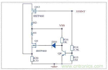 主要把NE555D產(chǎn)生的一個(gè)36.7KHZ的脈沖功率放大,經(jīng)發(fā)射線(xiàn)圈發(fā)射出去。當(dāng)脈沖為高電平時(shí),Q12柵極為高電平,Q12導(dǎo)通,此時(shí)Q8飽和,Uceq電壓只有0.67V,經(jīng)D10-4148后Q1柵極電壓為0,Q1截止。當(dāng)脈沖為低電平時(shí),Q8、Q12同時(shí)截止,電流直接由R16 D10 Q1,Q1導(dǎo)通。整個(gè)過(guò)程中Q1與Q12均以一開(kāi)一關(guān)的形式工作。電路如圖2: