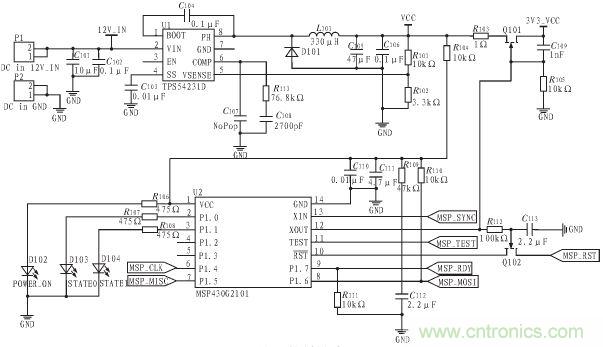 本文通過(guò)增加TI的MSP430低功耗MCU配合BQ500410A來(lái)實(shí)現(xiàn)系統(tǒng)的低功耗。為了實(shí)現(xiàn)低功耗,一種最直接的方法是無(wú)負(fù)載時(shí)直接關(guān)斷電源使BQ50041A 完全關(guān)機(jī)。但是這樣做的話,包括充電狀態(tài)、錯(cuò)誤狀態(tài)、操作模式及驅(qū)動(dòng)引腳狀態(tài)信息等將會(huì)完全丟失。增加MSP430 后,BQ500410A 可以周期性的關(guān)機(jī)來(lái)節(jié)節(jié)省功耗,其喚醒信號(hào)由MSP430 來(lái)提供。同時(shí),各種狀態(tài)信息也由MSP430 來(lái)保存,LED 狀態(tài)指示燈也由原先的BQ500410A 驅(qū)動(dòng)變?yōu)橛蒑SP430 來(lái)驅(qū)動(dòng)。如此一來(lái),雖然系統(tǒng)的復(fù)雜度及成本提高了, 但是待機(jī)功耗由原先的300 mW 降低到90 mW 左右。