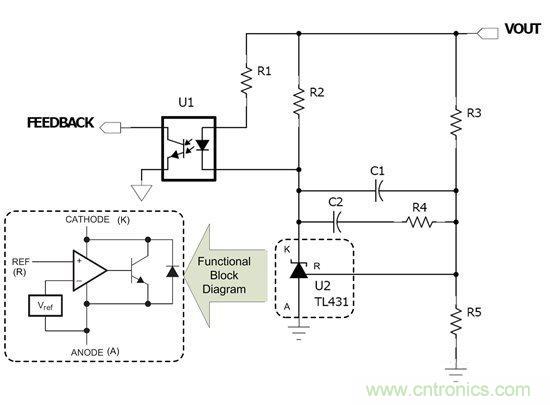 圖1:常用于調(diào)節(jié)隔離式電源輸出電壓的 TL431 電路