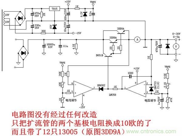 一般電源都用2N3055擴流,可是我要是用的話3055得現(xiàn)買剛好查資料13005也可以做擴流,而且手頭又有一大批電子鎮(zhèn)流器,基本上都是一批下來的,剛好參數(shù)也差不多就廢物利用了,整個電源改造沒花一分錢就是耗時,估計得四天以上。