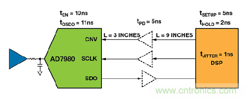在圖4 中,DSP 主機(jī)訪問 AD7980 處于3 線 CS 模式下,其中,VIO = 3.3 V。DSP 鎖存SCLK 下降沿上的SDO 信號。DSP 的額定最小建立時間為5 ns,最小保持時間為2 ns。對于典型的FR-4PCB 板,傳播延遲約為180 ps/in。緩沖器的傳播延遲為5 ns。CNV、SCLK 和SDO 的總傳播延遲為