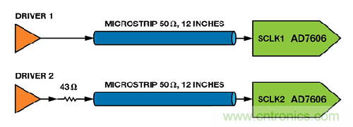 在圖7 中,一個驅(qū)動器通過一條12 英寸的微帶線路連接SCLK1,另一個驅(qū)動器通過一個與微帶串聯(lián)的43 Ω 電阻連接SCLK2。