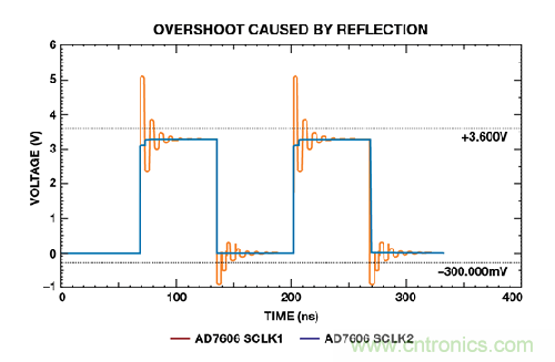 在圖8 中,SCLK1 上的大過沖違反了–0.3 V 至+3.6 V 的絕對最大額定值。串聯(lián)電阻可減小SCLK2 上的壓擺率,使信號處于額定值之內(nèi)。