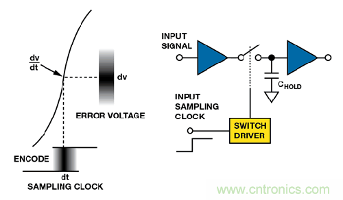 孔徑或采樣時鐘抖動設(shè)定SNR 限值,尤其是對高頻輸入信號。系統(tǒng)抖動有兩個來源:來自片內(nèi)采樣保持電路的孔徑抖動(內(nèi)部抖動),以及采樣時鐘上的抖動(外部抖動)??讖蕉秳訛檗D(zhuǎn)換間的 采樣時間變化,為ADC 的函數(shù)。采樣時鐘抖動通常為主要誤差源,但兩個源都會導(dǎo)致模擬輸入采樣時間變化,如圖9所示。它們的影響難以區(qū)分。