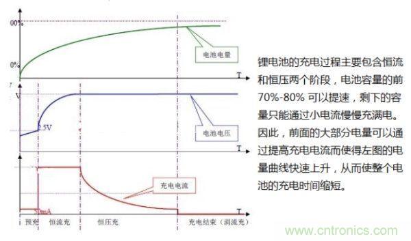 隨著對鋰電池容量的要求越來越高,鋰電池廠家也在加快新型電池的研發(fā),額定充電電壓從傳統(tǒng)的4.2V提高到4.35V,目前又出現(xiàn)了4.4V充電電壓的鋰電池,容量進一步提高。而傳統(tǒng)的充電器輸出電壓為5V,充電控制電路會調(diào)節(jié)充電電壓和電流滿足鋰電池的充電特性。不同鋰電池的化學(xué)特性不同,因此充放電性能及安全性能也就不同,有的電池芯適合大電流充放電,而有些電池芯可以耐高電壓,所以,采用何種快速充電方式要取決于鋰電池芯的具體特性。提高充電器的輸出電壓可以在恒流階段提高充電功率,實現(xiàn)快速充電。