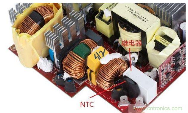 繼電器。安裝在這里的NTC的作用也是抑制電源接通瞬間的浪涌電流,保護(hù)電子設(shè)備。原理簡(jiǎn)而言之就是“阻值隨溫度升高而降低”。舉個(gè)例子,假設(shè)上圖電源的NTC在“零電流通過(guò)/零功率”狀態(tài)下的阻值為20歐,當(dāng)機(jī)器冷啟動(dòng)時(shí),瞬態(tài)電流讓NTC阻值急速下降至低于1歐,隨著后續(xù)持續(xù)電流的輸入,NTC持續(xù)發(fā)熱,維持在低阻值,功耗極低。