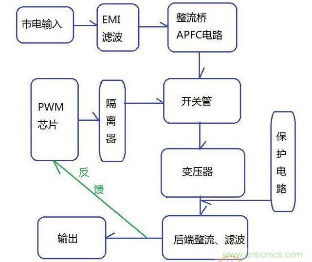 圖1是一個(gè)典型的雙管正激拓?fù)浣Y(jié)構(gòu),肖特基整流、單路磁放大穩(wěn)壓,由CWT代工。1是EMI濾波電路。2主要是APFC(主動(dòng)式功率因數(shù)校正),主要包括整流橋、主動(dòng)PFC電感和升壓電容、PWM芯片。3主要包括變壓器和磁放大電感、待機(jī)驅(qū)動(dòng)芯片。4是后端整流,二次側(cè)(輸出端)電路。兩條散熱片上,2和3間釘著開(kāi)關(guān)管,3和4間釘著整流管。圖上沒(méi)框住的還有三顆光耦,沒(méi)特意標(biāo)出的有保護(hù)電路、輸出線材、背部元件、電路板等。大體示意圖表示如圖2: