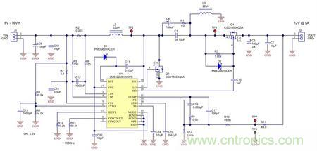 SEPIC擁有兩個(gè)開關(guān)節(jié)點(diǎn)(TP2、TP3),而不是單個(gè)升壓的開關(guān)節(jié)點(diǎn)。SEPIC同步場(chǎng)效應(yīng)晶體管(FET)(Q1)的柵極不能直接連接到升壓型控制器的高側(cè)驅(qū)動(dòng)器,因?yàn)樗脑礃O(TP3)與它的SW引腳(TP2)不在同一電位。為了驅(qū)動(dòng)它,筆者添加了一個(gè)由R3/D2/C15構(gòu)成的浮動(dòng)電平移位器電路。C15具有跨越其兩端的VIN的電壓降,這與“快速”電容器C1的電壓相同,從而能提供跨Q1柵極至源極的正確電壓擺幅。R3/D2可恢復(fù)正確的柵極驅(qū)動(dòng)器偏移量(低 = - 0.5V,高 = 7V)。
