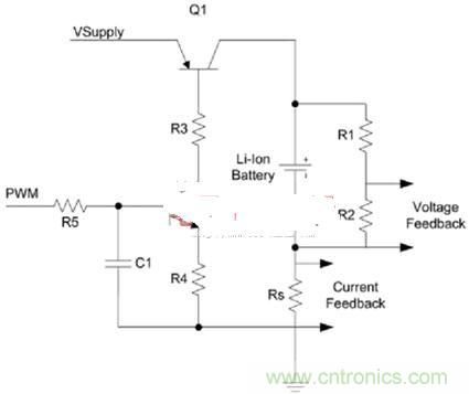 通過控制串聯(lián)導通晶體管Q1的偏置實現(xiàn)對充電電流的控制。可使用數(shù)模轉(zhuǎn)換器(ADC)或脈寬調(diào)制器(PWM)配合外部RC低通濾波器來控制偏置。線性方法適用于充電電流(<1A)較低的情況,因為串聯(lián)導通元件會面臨功率消耗問題。