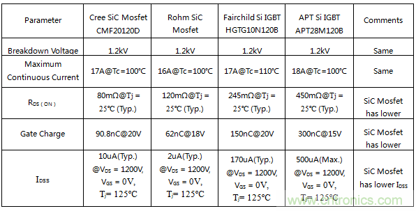 目前市面上常見的SiC Mosfet電流均不大于50A,以常見的1200V/20A為例,列舉了Cree公司與Rohm公司的SiC Mosfet管的部分電氣參數(shù);同樣例舉了Fairchild 與APT公司的1200V/20A Si IGBT系列的電氣參數(shù)進(jìn)行比較;