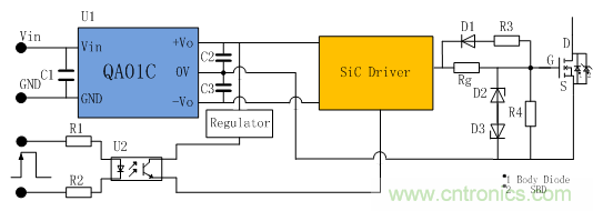 QA01C具有完整的驅(qū)動(dòng)電路推薦,通過(guò)SiC驅(qū)動(dòng)專用電源得到不對(duì)稱的正向驅(qū)動(dòng)電壓20V,負(fù)向偏置關(guān)斷電壓-4V;為了防止驅(qū)動(dòng)電壓對(duì)柵極造成損壞,增加D2和D3來(lái)吸收尖峰電壓是很有必要的。SiC驅(qū)動(dòng)器采用一般驅(qū)動(dòng)芯片即可;為了實(shí)現(xiàn)控制信號(hào)與主功率回路的隔離,需要采取隔離措施,推薦采用常見的光耦隔離方案。采用的光耦必須具有高共模抑制比(30KV/us)和比隔離電源大的隔離耐壓并且具有極小的延遲時(shí)間來(lái)適應(yīng)SiC Mosfet管的高頻率工作特性。