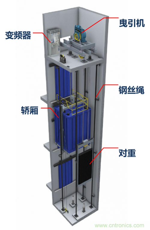 傳統(tǒng)電梯的動(dòng)力部分主要由曳引機(jī)(卷?yè)P(yáng)機(jī))、變頻器、轎廂、鋼絲繩、對(duì)重組成。曳引機(jī)通過(guò)卷動(dòng)鋼絲繩,調(diào)節(jié)轎廂和對(duì)重的平衡,實(shí)現(xiàn)對(duì)轎廂高度的控制,即電梯的上下。其中曳引機(jī)本質(zhì)就是一臺(tái)由變頻器驅(qū)動(dòng)與控制的大功率電機(jī),需要安置在大樓頂層——這就造成了電梯無(wú)法上頂層的問(wèn)題了,因?yàn)轫攲拥碾娞菸恢帽灰芬龣C(jī)和變頻器占據(jù)了。這問(wèn)題一直存在了很久的時(shí)間,因?yàn)檫^(guò)去曳引機(jī)基本都用交流異步電機(jī),且功率輕松上幾十KW,體積非常大,且不能露天放置,只能一直占著頂樓的房間。