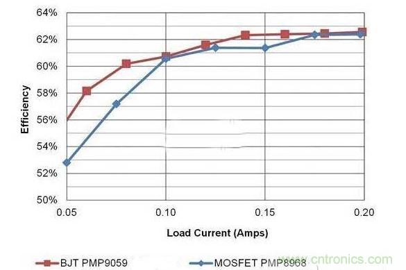 在低功耗(3W 及以下)反激式電源中,很難在成本上擊敗 BJT。大批量購買時(shí),一個(gè) 13003 NPN 晶體管價(jià)格可低至 0.03 美元。該器件不僅可處理 700V VCE,而且無需過大的基流便可驅(qū)動(dòng)幾百毫安的電流。使用 BJT,增益和功率耗散可能會(huì)將實(shí)際使用限制在低功耗應(yīng)用中。在這些低功耗標(biāo)準(zhǔn)下,MOSFET 與 BJT 之間的效率差異非常細(xì)微。下圖 1 對比了兩個(gè)相似 5V/1W 設(shè)計(jì)的效率。第一個(gè)設(shè)計(jì)是“230VAC 輸入、5.5V/250mA 非隔離式反激轉(zhuǎn)換器”使用 MOSFET,而另一個(gè)設(shè)計(jì)則是“120VAC 輸入、5V/200mA 反激轉(zhuǎn)換器”使用 BJT。這并不是完全公平的對比,因?yàn)檫@兩個(gè)電源在設(shè)計(jì)上采用不同的輸入電壓運(yùn)行,但它說明了它們的效率有多相似。