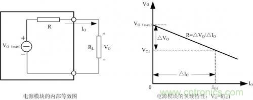 圖 1為電源模塊的內(nèi)部等效與輸出負(fù)載特性曲線:VO=f(IO),R為模塊的輸出阻抗(包含導(dǎo)線電阻和接觸電阻等),空載時(shí),模塊輸出電壓為最大值VO(max)。當(dāng)負(fù)載電流變化△IO時(shí),負(fù)載電壓變化量為△VO,△VO=R*△IO,R*△IO也表示模塊的負(fù)載調(diào)整率。負(fù)載電壓VO與負(fù)載電流IO的關(guān)系可表示為: