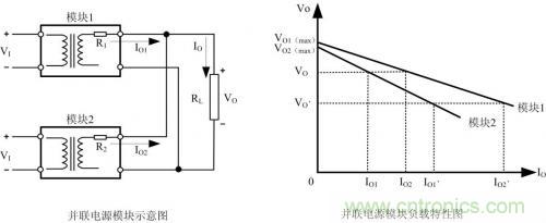 如果兩個(gè)模塊的參數(shù)完全相同時(shí),即:VO1(max)= VO2(max)、R1=R2,則兩條負(fù)載特性曲線重合,能實(shí)現(xiàn)負(fù)載電流均勻分配。但在實(shí)際應(yīng)用中,兩個(gè)具有相同容量的模塊,VO1(max)與VO2(max)、R1與R2的參數(shù)也不可能完全做到相同。從圖 2可以看出,由于輸出到負(fù)載RL的等效阻抗R1、R2很小,輸出電壓即便出現(xiàn)很小的差別也會(huì)引起輸出電流很大的變化。例如:當(dāng)負(fù)載RL電流由IO= IO1+ IO2增大到IO、=IO1、+IO2、時(shí),負(fù)載特性曲線斜率小的模塊1將承受大部分負(fù)載電流,模塊1將運(yùn)行在滿載或過載限流狀態(tài),影響模塊的可靠性。