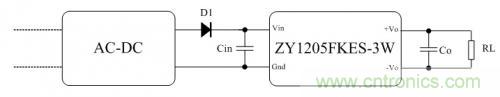 AC-DC電源模塊輸出電壓為12V,最大輸出電壓精度為±3%,那么輸出電壓范圍是11.64V~12.36V。而二極管D1使用1N4148,正向?qū)▔航禐?.7V,那么ZY1205FKES-3W模塊實(shí)際輸入電壓的范圍只有為10.94V~11.66V,這個電壓范圍還是在ZY1205FKES-3W模塊的輸入電壓范圍內(nèi),模塊可以正常工作,只是輸出電壓會較低。