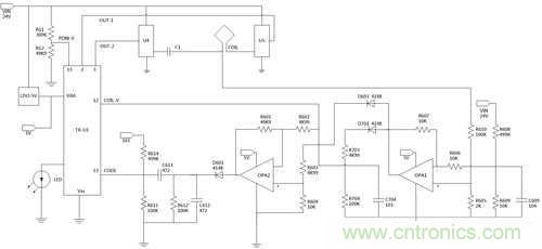 在圖4中由兩個運算放大器OPA1、OPA2構(gòu)成兩個差動放大電路,其OPA1動作為由R608與R609進行分壓驅(qū)動電源作為差動參考點;另外,由R610與R605對線圈諧振訊號進行分壓作為放大訊號輸入,在此有一配置為R608、R609與R610、R605之分壓比例皆為50比1,其用意在于取出與電源驅(qū)動電壓與諧振訊號中開關(guān)電壓失真相等后,透過差動放大出諧振訊號高于電源驅(qū)動電之成分進行放大。