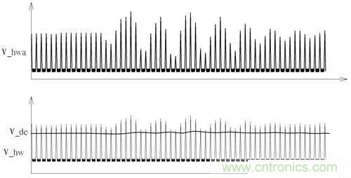 另外一路由D603透過分壓電阻R603、R604后輸入到OPA2作為差動放大輸入端,其訊號為圖5中之V_hw訊號再經(jīng)OPA2放大后輸出為V_hwa訊號,D603、D701用來控制V_dc與V_hw有相同的壓降,而R603、R604、R703、R704用來設(shè)定分壓比例使得V_dc能保持在略低于V_hw之訊號,確保OPA2可以只放大波峰中高低變化之部分。