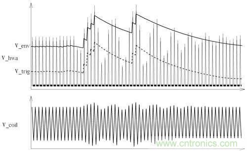 OPA2輸出訊號再傳送到D601、R612、C612為一檢波電路,參考圖6中經(jīng)過D601訊號為V_env該訊號為波峰訊號之檢波結(jié)果,但該訊號之直流穩(wěn)態(tài)非固定值,所以在透過C613、R614、R615構(gòu)成之去交連耦合電路得到之波形為V_trig,而該波型最后傳到TX-U1進行解碼處理,在圖6中能看到原供電線圈上之訊號V_coil轉(zhuǎn)換到V_trig之差異。