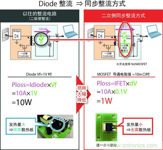 在以往的AC/DC轉(zhuǎn)換器中,基于電路簡(jiǎn)單、相對(duì)廉價(jià)的原因,整流元件一般使用二極管,但這種二極管的正向電壓(Vf)導(dǎo)致的導(dǎo)通損耗一直是高效化的障礙。另外,為抑制二極管的發(fā)熱,還需要散熱器等散熱措施,這就需要相應(yīng)的空間,在安裝方面也帶來(lái)一些問(wèn)題。作為降低這種損耗的對(duì)策,如今已經(jīng)逐步開(kāi)始采用同步整流方式。