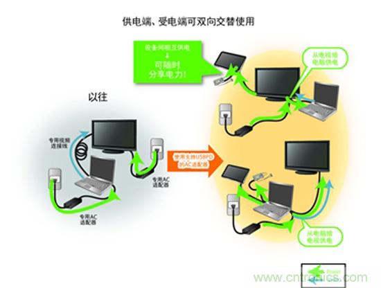 USB PD通過(guò)USB連接可實(shí)現(xiàn)高達(dá)100W的供電。USB PD根據(jù)不同設(shè)備的電源電壓要求,來(lái)調(diào)整AC/DC適配器等電源的輸出電壓。以往每臺(tái)設(shè)備都需要電源,而利用USB PD則可共享1個(gè)電源。另外,以往在設(shè)備之間主要 是數(shù)據(jù)通信,而通過(guò)USB PD可同時(shí)實(shí)現(xiàn)雙向相互供電(圖3)。