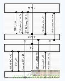 協(xié)助TLB進(jìn)行虛實(shí)地址轉(zhuǎn)換是CP0的主要功能之一。TLB屬于系統(tǒng)的特權(quán)資源,只有CP0有權(quán)對其進(jìn)行訪問,因此CP0與TLB之間的連線較多,數(shù)據(jù)交換的時(shí)延也比較關(guān)鍵。同時(shí),PC模塊與CP0的數(shù)據(jù)交換也非常重要。因此,CP0單元在版圖上最好同時(shí)靠近TLB和PC模塊。本設(shè)計(jì)將CP0中與TLB相關(guān)的邏輯與寄存器獨(dú)立為CP0T,放在MMU與PC模塊之間;CP0的其余部分歸為CP0E,放在PC下部,也就是整塊芯片的最下端。如下圖所示?! ?/div>