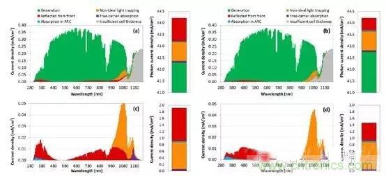對(duì)于晶體硅太陽電池,前表面的光學(xué)特性和復(fù)合至關(guān)重要。對(duì)于IBC高效電池而言,更好的光學(xué)損失分析和光學(xué)減反設(shè)計(jì)顯得尤其重要。McIntosh等人采用橢偏儀、量子相應(yīng)測(cè)試與數(shù)值模擬相結(jié)合的方法,定量的確定了IBC電池的光學(xué)損失,包括前表面發(fā)射、減反膜寄生吸收、長(zhǎng)波段不完美光陷阱、自由載流子吸收的影響等,如圖3所示。