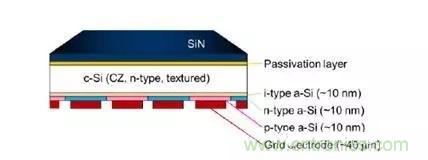 采用IBC與HJ技術(shù)結(jié)合的HIBC技術(shù)可以使電池效率進(jìn)一步提升,其結(jié)構(gòu)如圖4所示,在硅片表面同時(shí)采用本征的非晶硅進(jìn)行表面鈍化,在背面分別采用N型和P型的非晶硅薄膜形成異質(zhì)結(jié)。其優(yōu)點(diǎn)是利用非晶硅優(yōu)越的表面鈍化性能,并結(jié)合IBC結(jié)構(gòu)沒有金屬遮擋的結(jié)構(gòu)優(yōu)點(diǎn),采用相同的器件結(jié)構(gòu),日本松下和夏普公司目前取得了25.6%和25.1%的電池效率,這將成為未來IBC電池的重要方向。