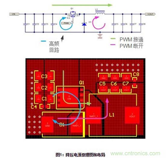 除了這些基本的布局規(guī)則,我通常首先會(huì)識別開關(guān)回路,然后確定哪些回路具有高頻開關(guān)電流。圖1所示為針對降壓電源(原理圖和布局)的簡化功率級的一個(gè)示例。