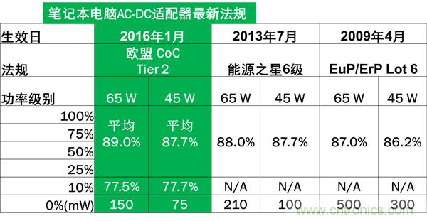 如于2016年1月1日生效的歐盟CoC V5 Tier 2 規(guī)定,輸出功率為45 W和65 W的AC-DC適配器平均能效需分別達(dá)到87.7%和89%,待機(jī)功耗分別低于75 mW和150 mW,并且還要求10%負(fù)載條件時(shí)的能效需分別達(dá)到77.7%和77.5%。電源設(shè)計(jì)工程師面臨體積、能效和成本等多方面的設(shè)計(jì)挑戰(zhàn)。