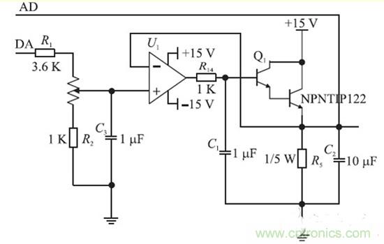恒流源電路原理結(jié)構(gòu)圖如圖2 所示,由于D/ A轉(zhuǎn)換輸出的模擬信號(hào)不穩(wěn)定,加上C3 穩(wěn)定電壓。經(jīng)過3.6 K 的電阻和1 K 的電位器加到單運(yùn)放OP07 的同相輸入端,調(diào)節(jié)電位器的阻值的大小可調(diào)節(jié)同相輸入端的電位,從而改變輸出點(diǎn)的電位,輸出電位加到達(dá)林頓管的B 管腳上,進(jìn)入達(dá)林頓信號(hào)產(chǎn)生自激信號(hào),通過C1過濾掉。利用達(dá)林頓管的電流放大特性,可實(shí)現(xiàn)大電流的輸出,電流放大倍數(shù)為1 000 ~15 000倍。
