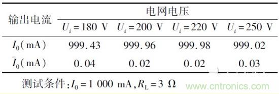 負(fù)載穩(wěn)定性測(cè)試條件為U0 =220 V/50 Hz,I0 =1000 mA,測(cè)試數(shù)據(jù)如表2 所示,其中負(fù)載穩(wěn)定度是指一定的工作情況下,負(fù)載變化引起的輸出電流變化。測(cè)試數(shù)據(jù)表明負(fù)載在0 ~10 贅變化時(shí),輸出電流最大偏差為0. 99 mA,紋波電流小于0. 05 mA.