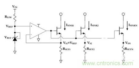 雖然基準(zhǔn)電壓的生成僅須一次實(shí)施即可,電流沉整個反饋部分的重復(fù)進(jìn)行卻使成本與設(shè)計空間密集化。那么問題來了:是否可以使用單個反饋源來實(shí)現(xiàn)這種偏置網(wǎng)絡(luò)呢?答案是肯定的,盡管這有些復(fù)雜,也須滿足某些特定條件。該網(wǎng)絡(luò)(本文分析中僅以電流沉為例)如圖1所示。