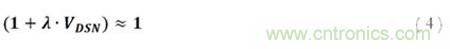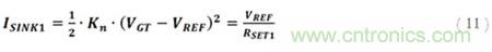 必須注意的是,這里可以很大程度上忽略通道寬度調(diào)制的影響。這是因?yàn)槿魏我蚵O電壓上升導(dǎo)致的漏極電流的上升會在通過RSET電阻后下降,并導(dǎo)致源電壓的上升。為了使MOSFET能維持任何電流,柵極電壓必須大于源電壓與閾值電壓的和。也就是說,給定一個柵極電壓,源電壓將被限制在至少比柵極電壓小一個閾值電壓的值,且再大的漏極電壓上升也不會提升漏極電流。因此,構(gòu)建相應(yīng)運(yùn)行條件,RSET必須足夠大,從而確保在上述限制下可允許作出以下假設(shè):